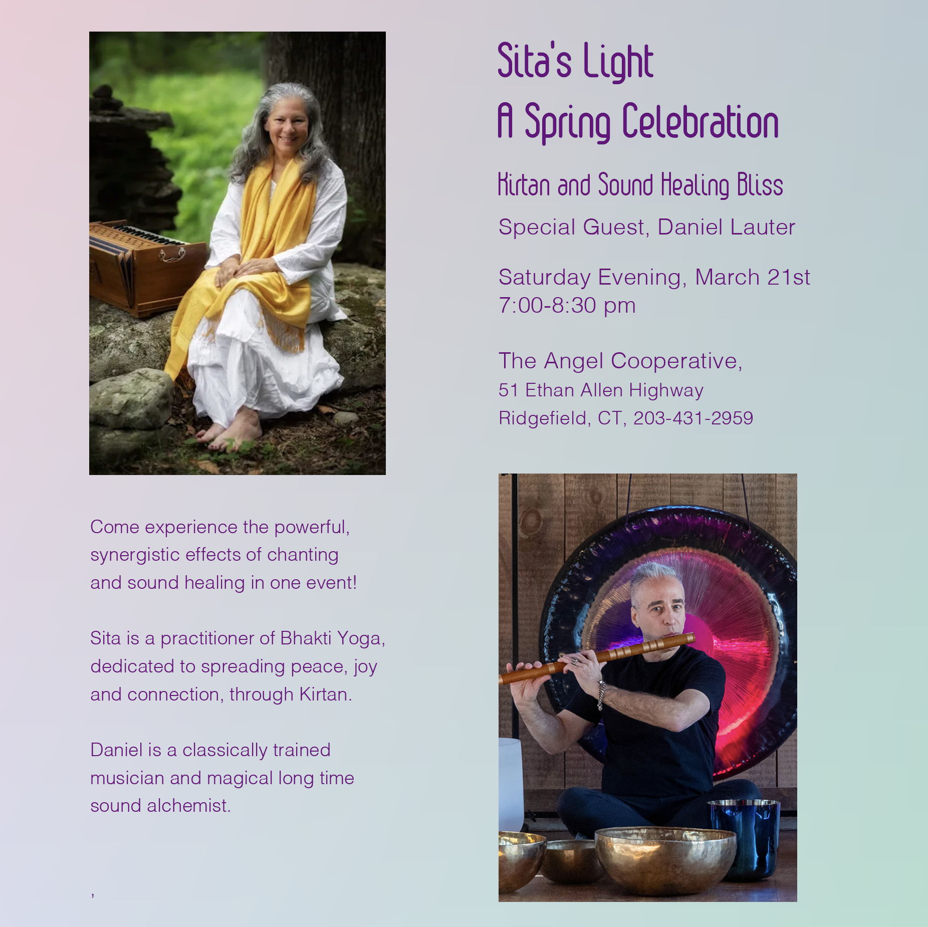 Come Experience the powerful, synergistic effects of chanting and sound healing in one event! Sita is a practitioner of Bhakti Yoga, dedicated to spreading peace, joy and connection, through Kirtan. Daniel is a classically trained musician and magical long time sound alchemist. Kirtn and Sound Healing Bliss!